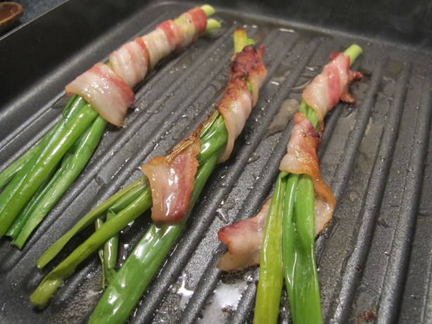 Wrap strips of bacon around strands of scallions, you may want to use toothpicks at either end to keep bacon in place while grilling. Place on grill pan or in non stick skillet on medium heat. Turn gently with tongs until bacon is cooked and scallions are wilted.