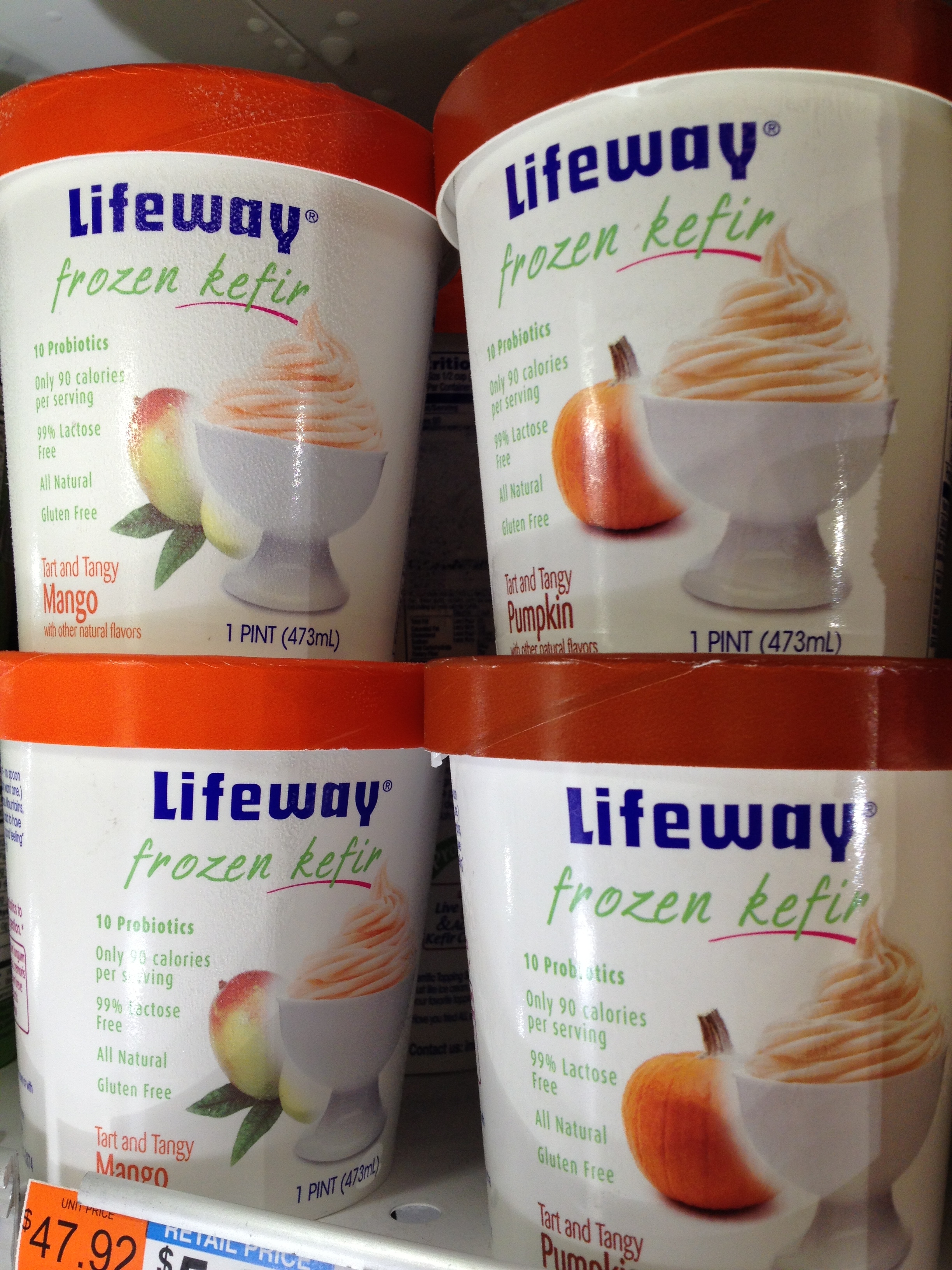 My evening with Arctic Zero may have been a bust, but that hasn’t stopped me from trying Gluten Free frozen desserts. I found a much better alternative in Lifeway Frozen Kefir, available in many different flavors (Mango, Strawberry, Chocolate, Pumpkin, Pomegranate, Original, and Dulce de Leche). Kefir is a type of grain that ferments milk, and appears on your grocery shelf as a thick, milk-like drink or yogurt. It is loaded with good for you probiotics, and the frozen, ice cream substitute version has significantly less carbohydrates than regular ice cream (serving size: 1/2 cup)