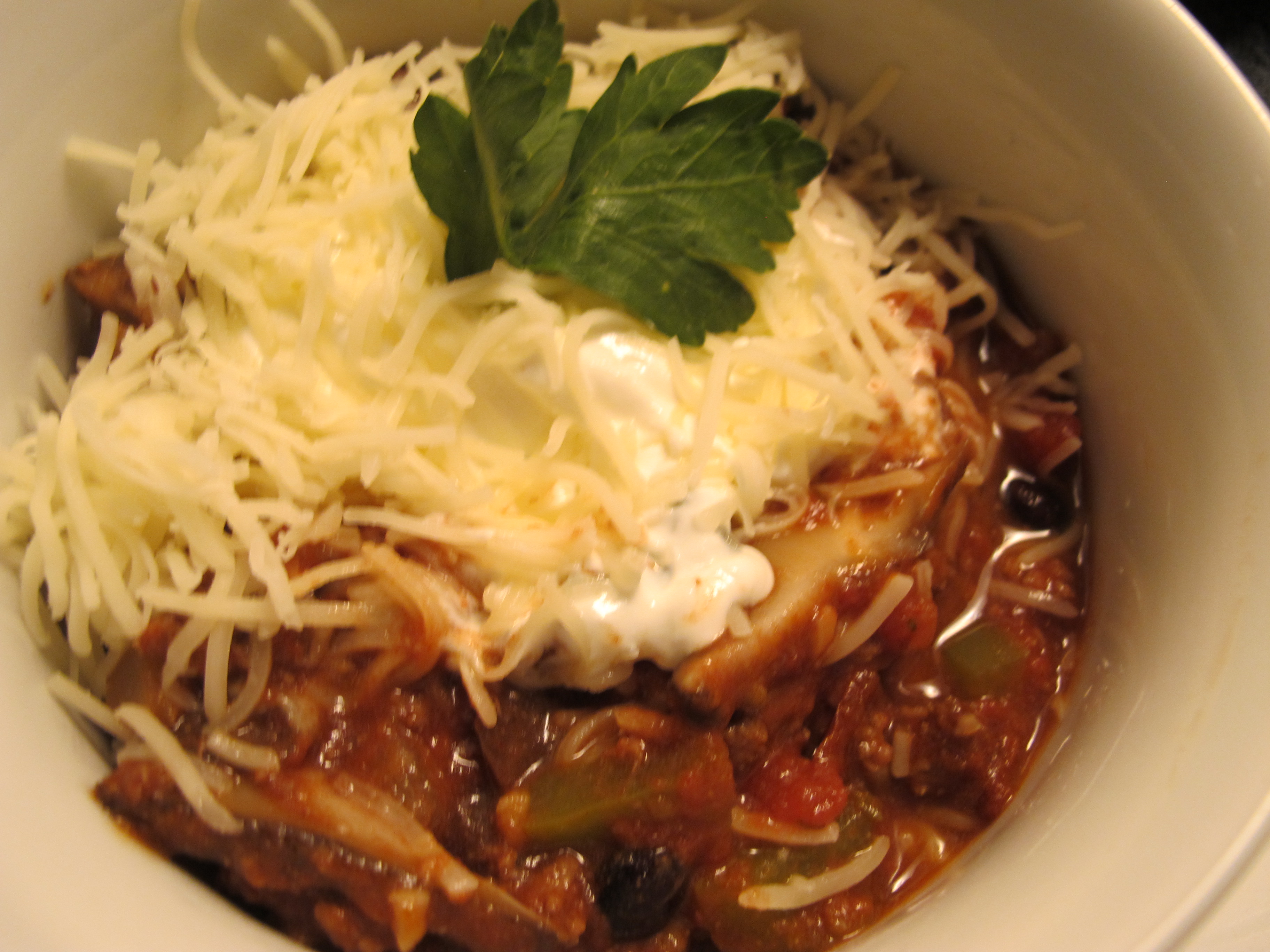 I’ve heard that Bison meat is healthier than beef, and according to this chart, that’s pretty accurate. (Note: it is also healthier than turkey, and a nice change if you are sick of Thanksgiving leftovers.) Bison is leaner than beef, with more protein but fewer calories, and less cholesterol – and it is almost identical in taste. So why not use it all the time? Because Bison is pricey. One pound retails for $9.99, while the same amount of high quality ground beef goes for $7.00 or less. You probably don’t want to spring for Bison burgers at your next cookout, but an easy and price-conscious way to try it is in this chili. It’s spicy but not hot, and the bison, vegetables, and lack of added fat keep it quite healthy (especially if you don’t add the cheese and sour cream). It might not be winning contests anytime soon, but it’s still worth trying.