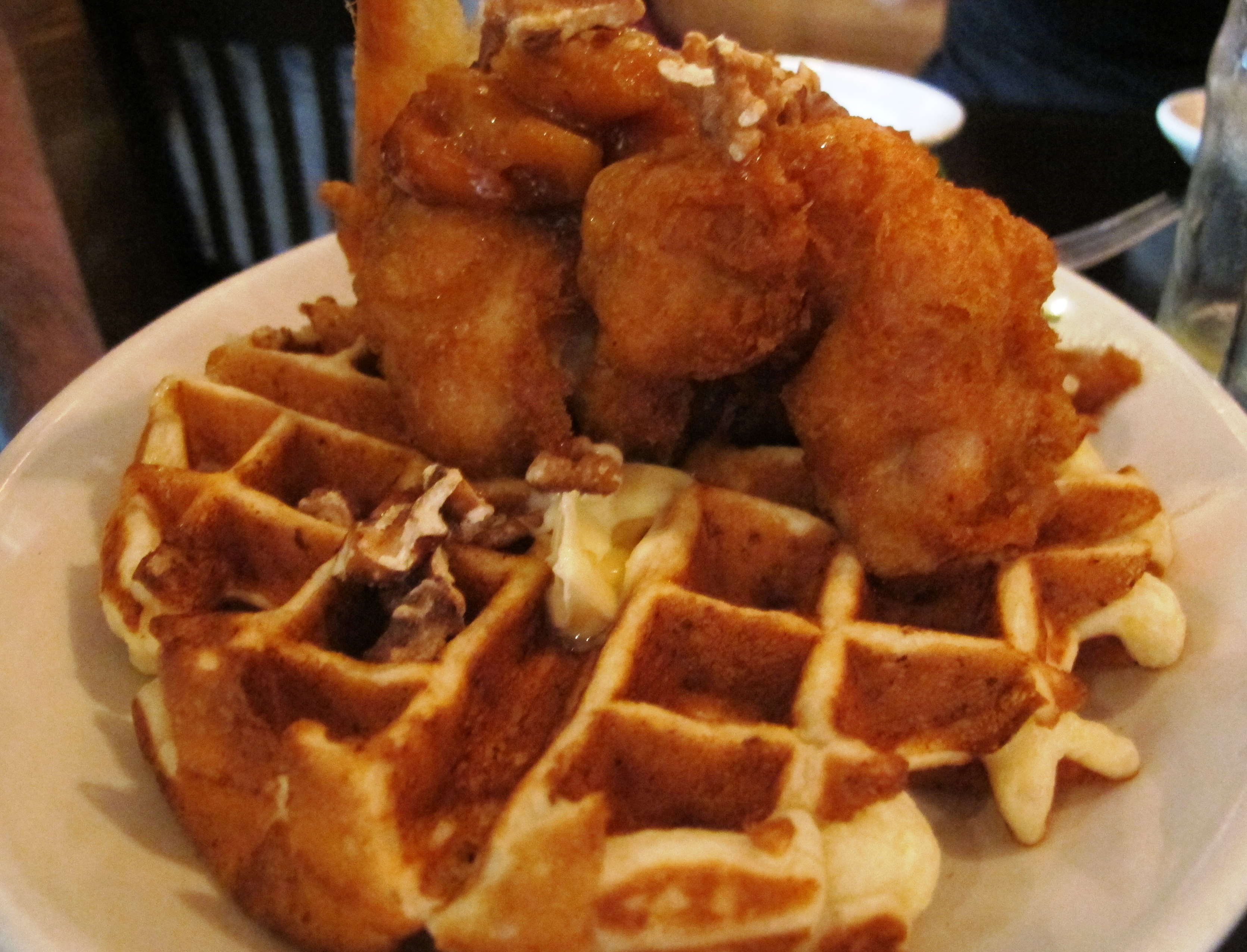 Chicken and waffle purists may think that an upscale waffle topped with fruit and perfectly beer battered chicken isn’t an acceptable iteration of this dish. But I think it’s just fine.
