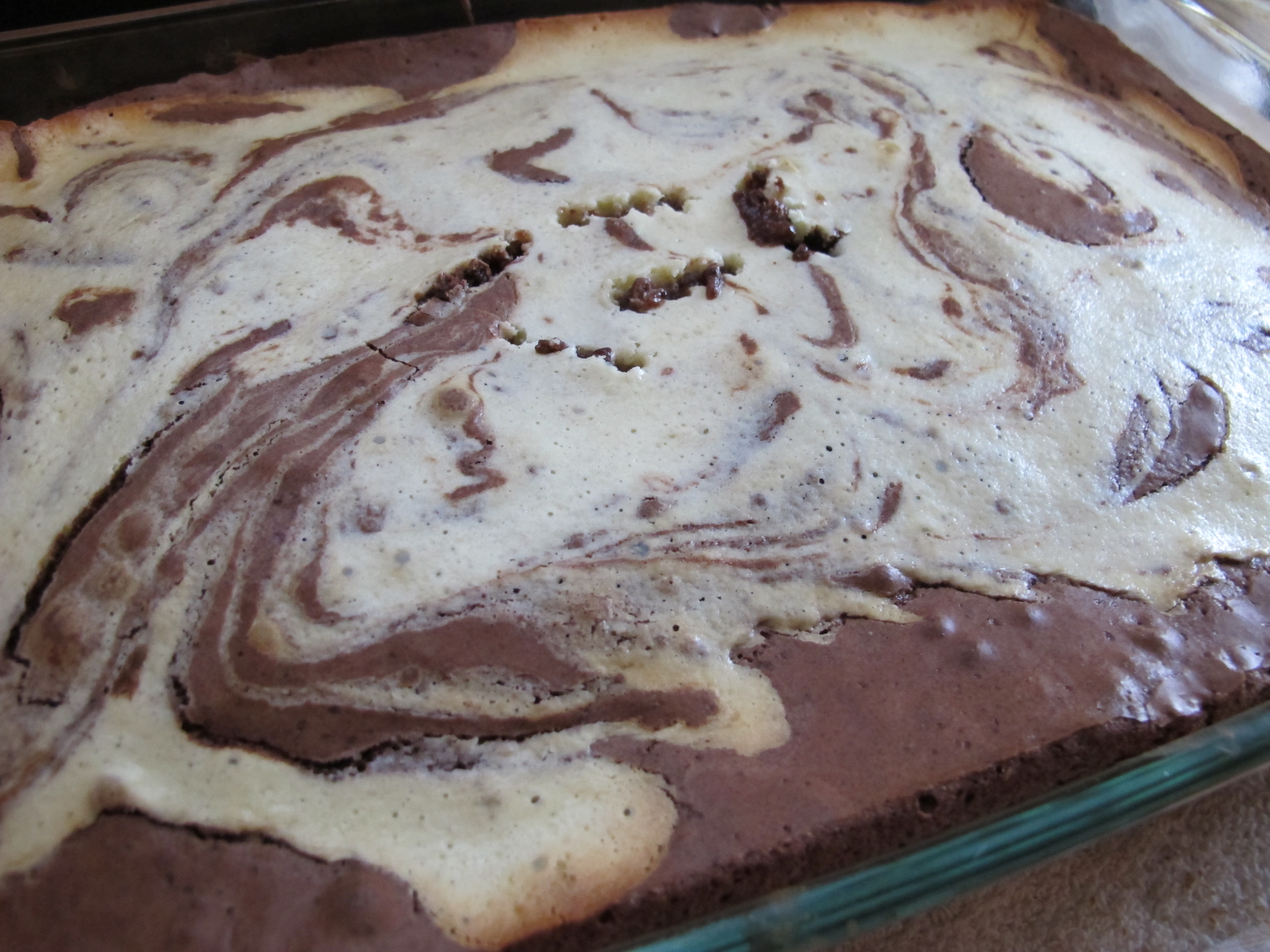 If I made these again I’d use 1 1/2 the suggested amount of almond, and I’d either skip the “white” part altogether, or double it. As it was, the cream cheese/sugar/egg mixture made a pretty marbling effect but didn’t do much for taste. Other possible alterations for the next time around? Adding some chopped cherries or walnuts.