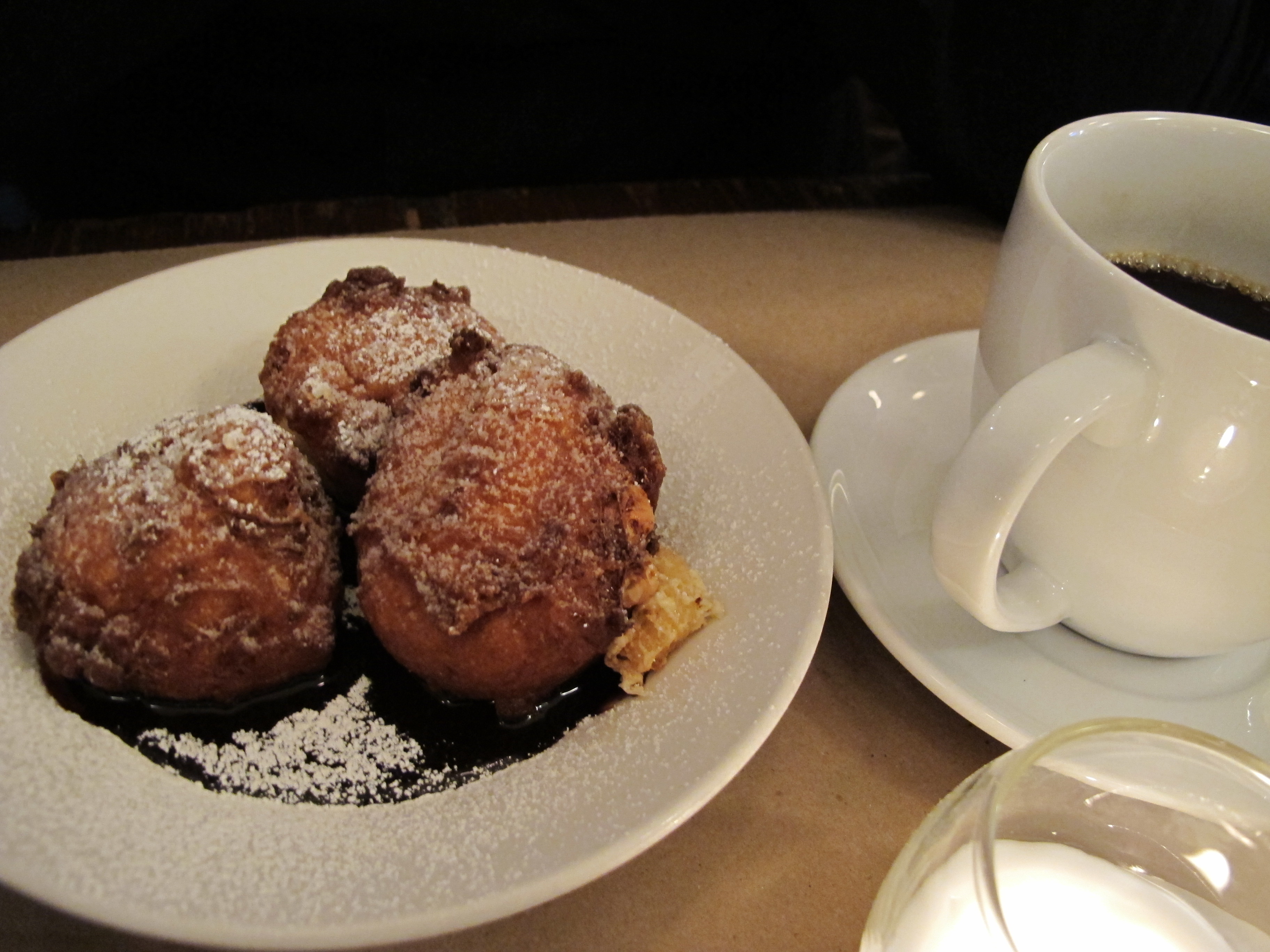 Dessert was Ricotta Fritters with Chocolate Sauce and Marscapone Ice Cream with Candied Lemon and Espresso. While both were good, I can easily say these were the best fritters I have ever had. I should qualify this by admitting that I don’t normally like fritters, but this doesn’t mean that I haven’t tried a lot of them. I always want to like them (pillows of fried dough, why not?) but the execution so often falls flat, dry, and oily. These were light, fluffy, and a great pairing to the chocolate sauce.