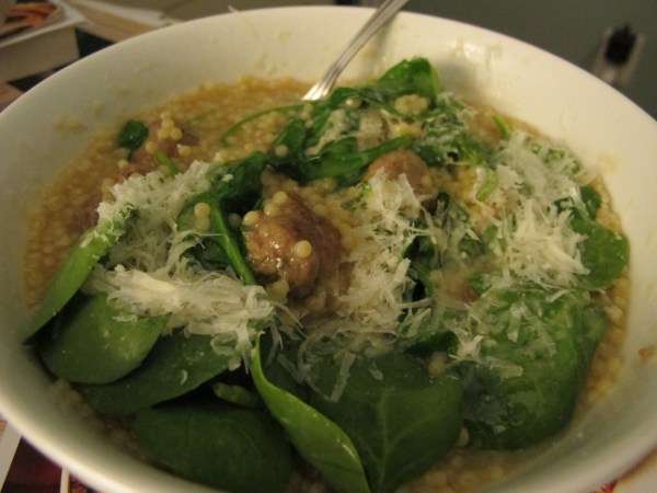 Add 1 and 1/2 containers of chicken broth to the pan with the meatballs still inside. Simmer meatballs for 45 minutes. Add pastina (or orzo, or acine de pepe) to broth, cook for ten minutes. Add more broth from second container, if needed/desired. Add salt to taste. Spoon soup into bowls, add spinach (it will wilt and cook itself in the hot liquid, almost immediately) and cheese to taste. Voila.