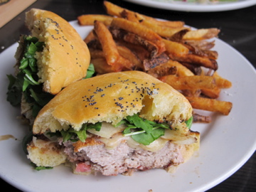 For lunch, offerings are simple – green salads, a grouping of burgers (beef, turkey, pork, and vegetarian options), or a choice from the “lunch plates” column, with options such as an Egg Salad Sandwich on Cyrus Pringle bread, or Pulled Tarragon Chicken Salad. And, like a lot of places in Vermont, you can get a sunny side up egg on anything (and you should, you really should). Because of the way The Farmhouse labels itself, I felt it was my duty to order a Misty Knoll Turkey burger and fries, to ensure the gastropub moniker wasn’t being misused.