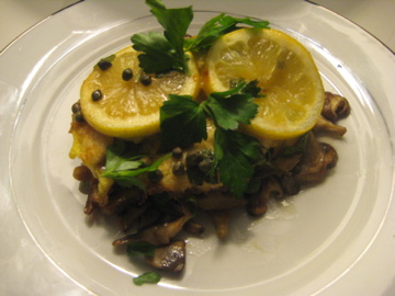 Add wine to pan, then add lemon juice and at least 2 more tbsp butter to this mixture, cook down. Place lemon slices on top of chicken in baking dish, sprinkle capers over all. Pour lemon/wine sauce on top, place parsley sprigs throughout dish.
