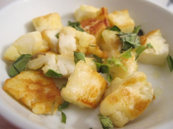 Put 1/4 inch olive oil in small non stick skillet, heat until crackling. Add halloumi, being careful not to crowd the pan – fry in more than one batch if you need to. Turn cheese cubes gently for 2-3 minutes until browned. Drain cheese, put in serving bowl, top with lemon juice and oregano. Toss. Serve.